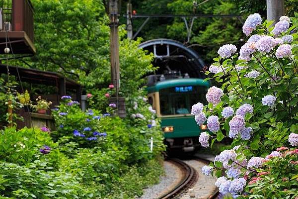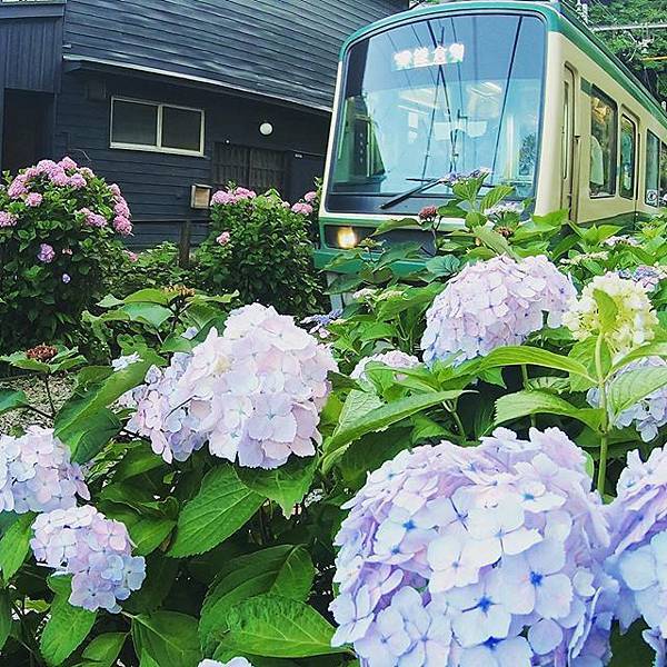 在花季可以看到很多的紫陽花,在御靈神社可以一次欣賞各樣顏色的繡球花,所以這裡的紫陽花也是相當很有名,意外發現有點像愛心的粉白色繡球花(好可愛)~現場也有許多攝影愛好者在這裡準備要拍攝,只能說要拍到電車通過的那一瞬間,實在很困難啊~ 重拍好幾次,最後只好錄影截圖比較快,另外提醒大家拍攝的時候,要小心不要離鐵軌太近~!!