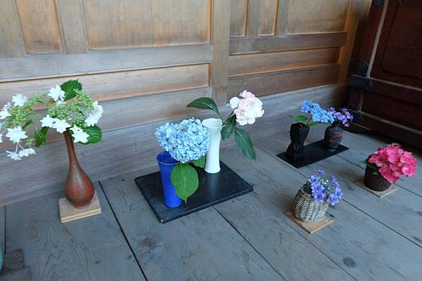 寺院內也有季節相關的擺設,跟其他景點比起來繡球花的顏色較豐富,雖然花量較其他寺院少 也開的比較晚,但成就院入場「免費」無料就可以參訪,人潮少根本不用排隊,感覺是個很超值的秘境,好不容易卡到一個花和海的位置,大家都在排隊輪流拍照(哈哈)